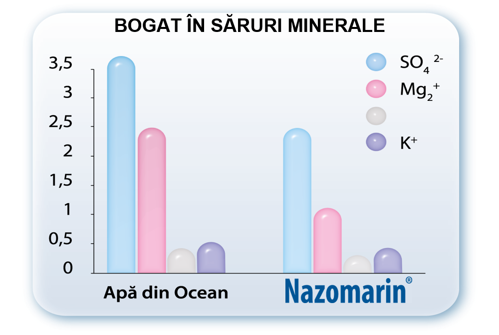 Concentrația optimă de săruri minerale (SO4 2-, Mg2+ ,Cu2+, K+) contribuie la crearea unui mediu neprielnic pentru viruși și bacterii, oferind protecție mucoasei nazale și un efect antiseptic naturalCurăță mucoasa nazală în profunzime