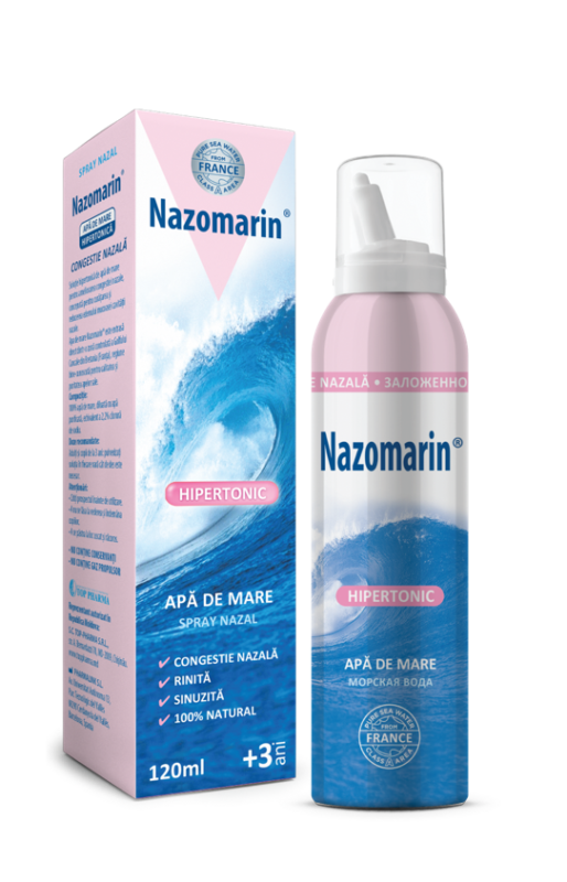 Nazomarin® Hipertonic conține soluție hipertonică de apă de mare Nazomarin Hipertonic este un dispozitiv medical pentru lavaj nazal. Spray cu difuzie în JET continuu și liniar, cu presiune controlată, destinat lavajului Nazal.